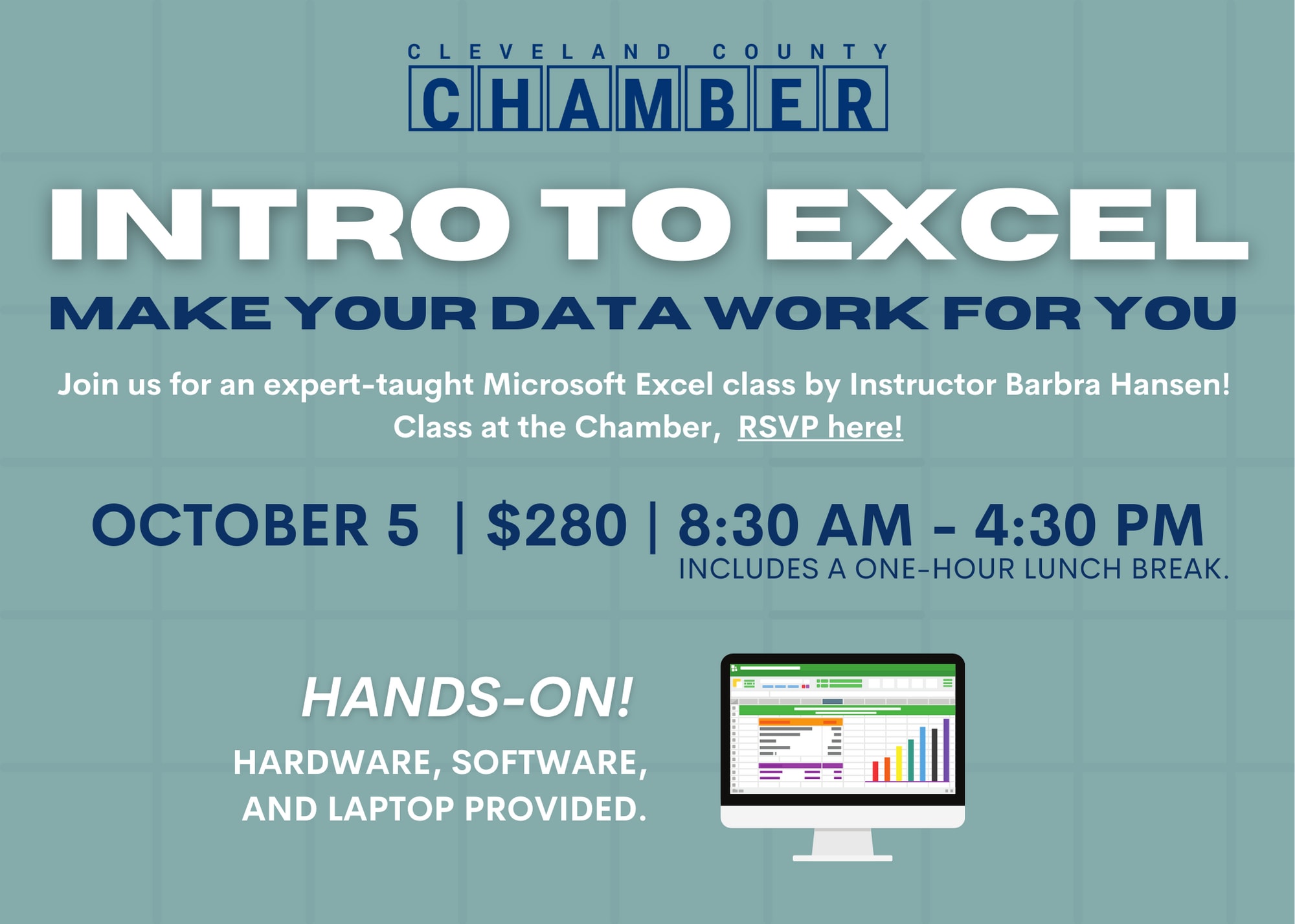 Make your data work for you! Certified Microsoft Excel Instructor Barbra Hansen will be giving us a hands-on learning experience to make your data do its job!