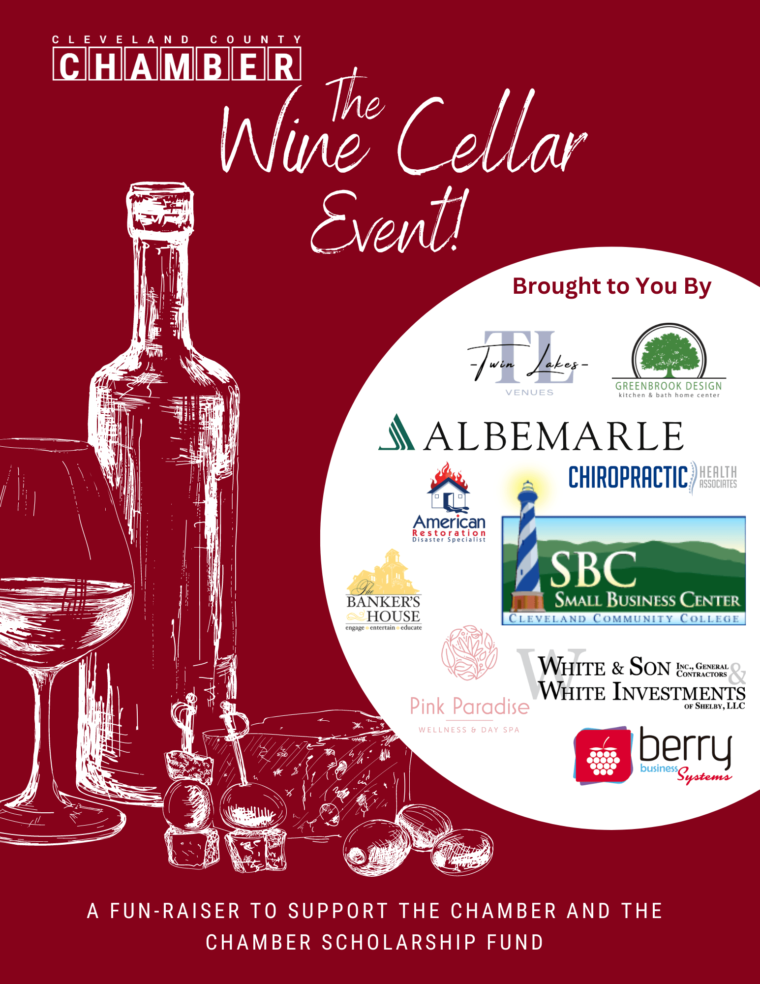 Wine Cellar Event tickets- $40 - Includes- Entrance to the event, 1 Wine Cellar Raffle ticket and 5 basket raffle tickets. -Ticket required for event entry. Please pickup at the Chamber or call for mailing.